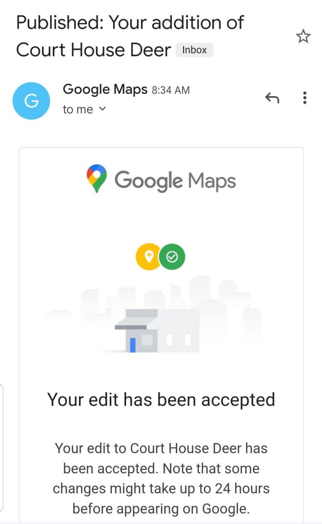 I wondered if there was any way to submit something to Google Maps, and after a little googling discovered that yes, there is. I submitted my suggested addition and shortly afterward got this response in my Gmail: