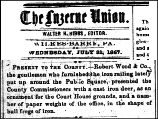 In the 1860s, the Luzerne County Courthouse was located in the Public Square in Wilkes-Barre. The Robert Wood & Company of Philadelphia, fabricator of ornamental ironworks, was hired to create an iron fence to surround the Public Square. Shortly thereafter, the company presented Luzerne County with a deer statue, as is seen in the newspaper article below: