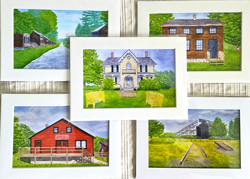 While at Eckley, when I’m not giving the book talk I’ll be set up at a table in the village with my this and my other two books–“Coal Country Connections” and “Conversations with the Court House Deer” as well as prints of some of my artwork of Eckley: