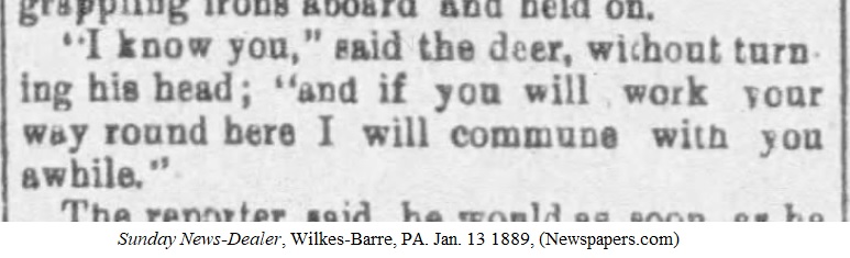 Said the deer? I forgot all about the lawyer and opened the full article to read it. After being thoroughly entertained by it, I searched for more articles with this talking deer, called the Court House Deer in the article. I found 77 of them written by reporter Ernest Hanson in the late 1880s.