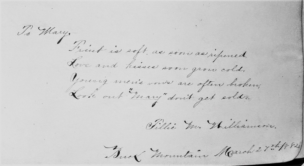 As the winter ended, Company K became involved in military engagements, and as part of the Army of the Potomac fought in the Seven Days Battles on the Virginia Peninsula. John was killed on the sixth day of those battles, at Charles City Crossroads. He is one of the “not accounted for.” His baby daughter Matilda was 3 months old at the time of his death. When she was a teenager, Matilda was one of the signers of Mary Boyd’s autograph album (the focus of the book “Coal Country Connections“)